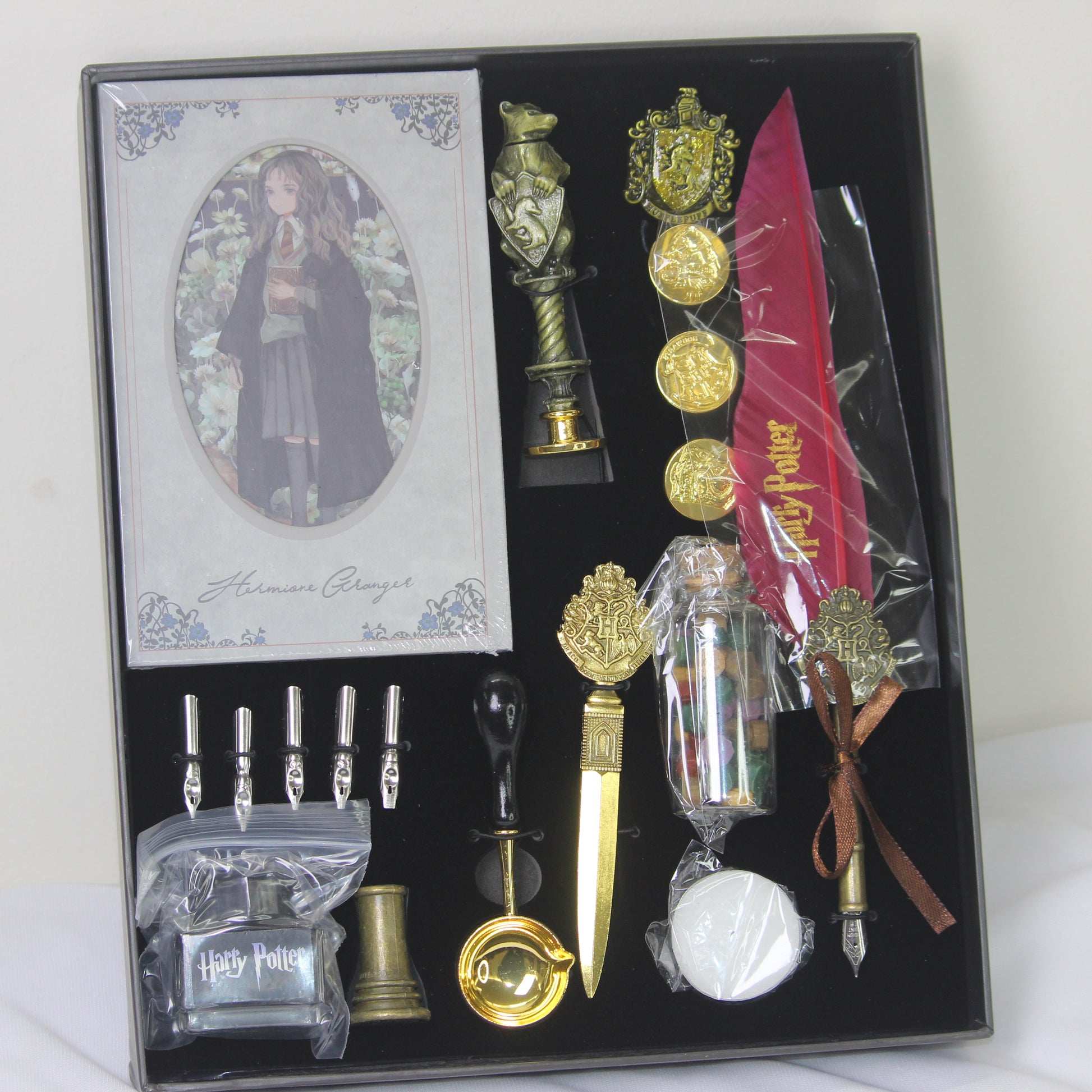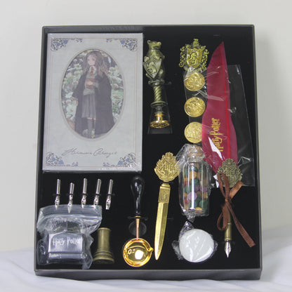 This Harry Potter stationery gift set includes a magical notebook, feather-style pen, Hogwarts-inspired metal pen, wax seal accessories, ink bottle, nibs, coins, decorative charms, and wizard collectibles – all neatly placed in a luxury display box. Every element reflects classic Hogwarts charm, making it an eye-catching collectible and a functional writing kit.