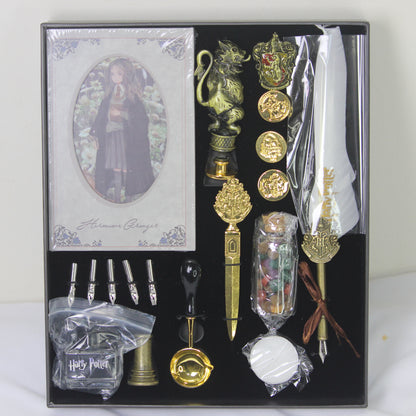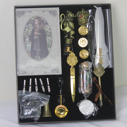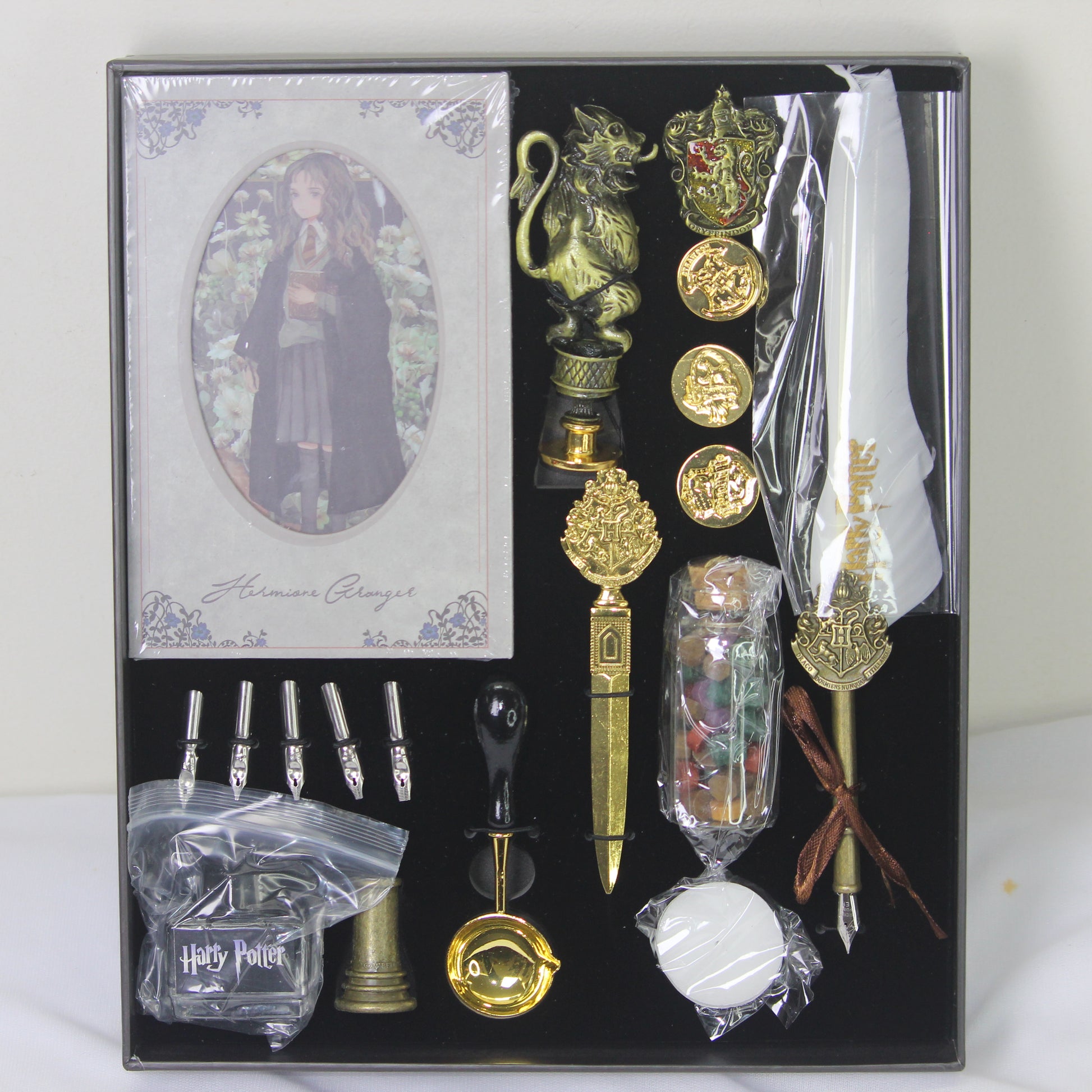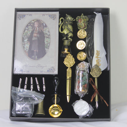 This Harry Potter stationery gift set includes a magical notebook, feather-style pen, Hogwarts-inspired metal pen, wax seal accessories, ink bottle, nibs, coins, decorative charms, and wizard collectibles – all neatly placed in a luxury display box. Every element reflects classic Hogwarts charm, making it an eye-catching collectible and a functional writing kit.